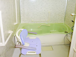 入浴は、お一人ずつで家庭用の浴槽です。手すり等は数多く設置せてあります。スタッフが、見守りや、お手伝いさせていただいております。
