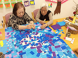午後のレクリエーションの時間、フェルト・折り紙・牛乳パックなどを使い、季節に応じた作品を制作します。共同で大きな作品も。