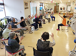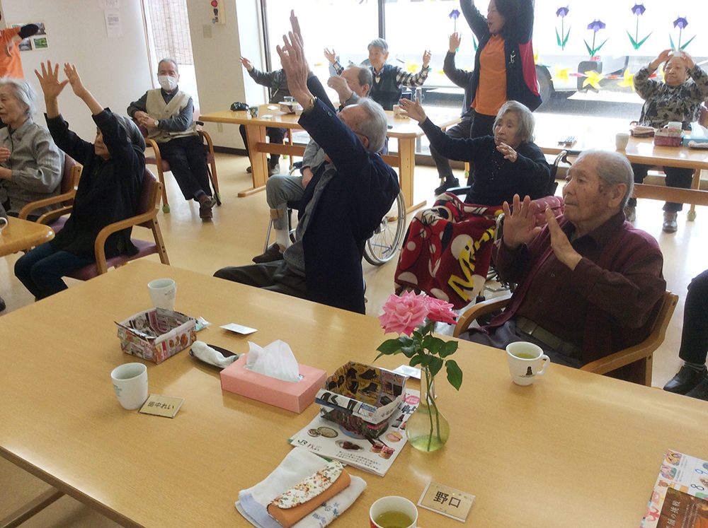 膝からすねにかけてさすってもらい腕ふり 足踏み 手を前に上に… 両足を そろえて前に横に 腿上げ 身体をねじりながら… 足踏み 手拍子をまじえて 深呼吸